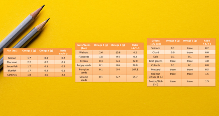 Check out these handy charts to find out what foods have a lot of omega-3s and not much omega-6s, and vice versa.